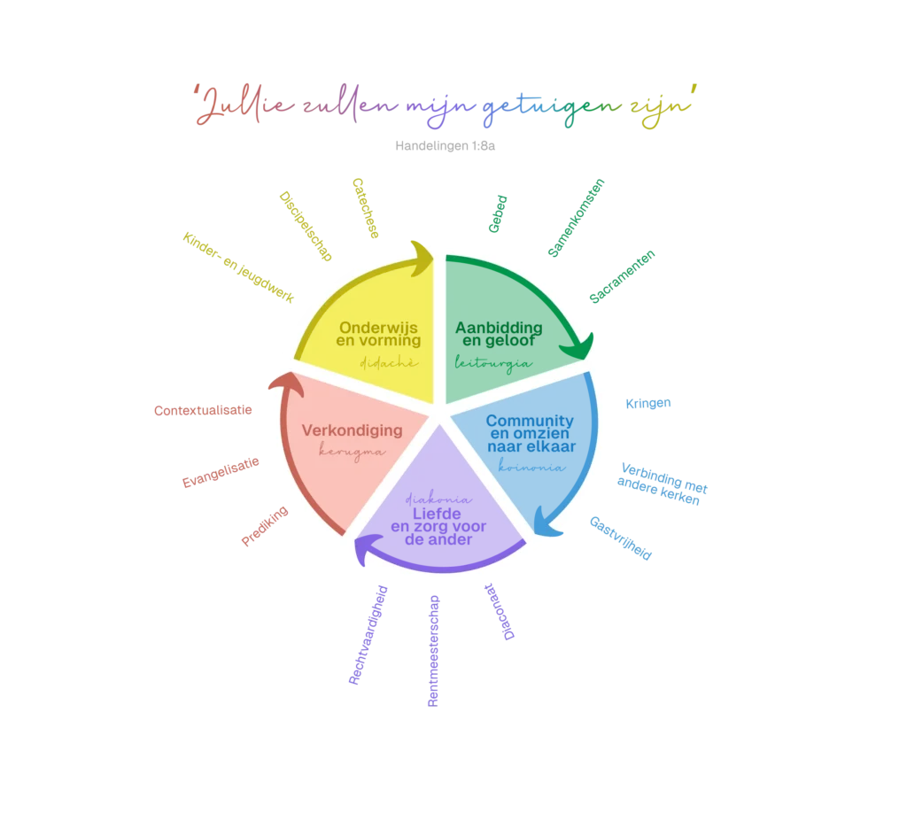 Wij kiezen er voor om te kijken naar de kerk in het Bijbelboek Handelingen. Niet als ideaalbeeld (want er ging ook genoeg mis) maar wanneer we naar Handelingen kijken zien we een kerk die langzaam vorm krijgt. Dat is zeker geen statische werkelijkheid. Er is een ontwikkeling gaande. Tegelijk zien we functies van kerkzijn die richtinggevend zijn voor geloofsgemeenschappen van alle tijden en op alle locaties. Het zijn zes Griekse woorden die tot op de dag van vandaag een belangrijke plek hebben in hoe we naar de kerk kijken. Het gaat om de woorden marturia, leitourgia, didachè, kerugma, diakonia, koinonia.